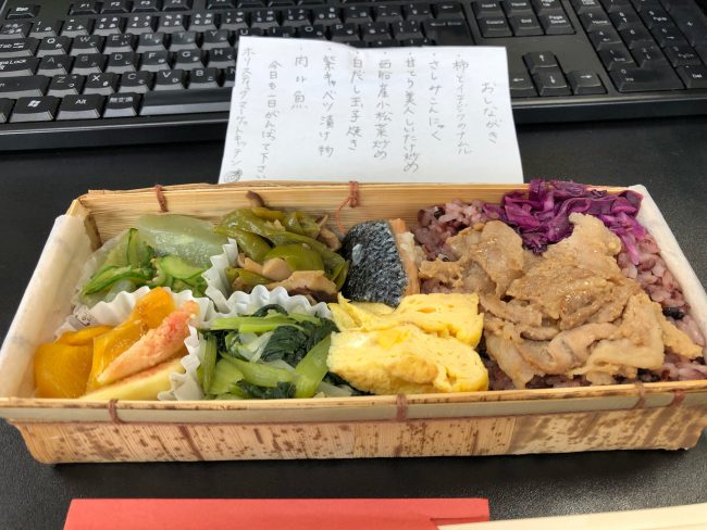 腸からきれいになる弁当 ブログBy 斉藤2018年9月26日Leave a comment 今日は管理職で腸からキレイになるお弁当を試食しました。 おしながき ・柿とイチジクのナムル ・さしみこんにゃく ・甘とう美人しいたけ炒め ・西船産小松菜炒め ・白だし卵焼き ・紫キャベツ漬物 ・お肉(甘酒と…