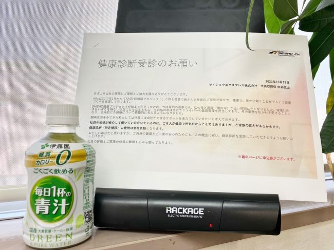 社員のご家族向けに健康診断受診の案内と青汁をお渡ししています。 ご家族の健康診断も会社負担で行っています。 健康診断の受診に繋がれば嬉しいです😊