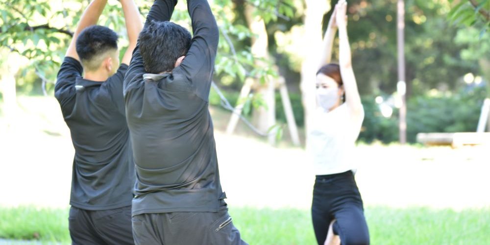 辰巳の森緑道公園の芝生広場でヨガを行いました。