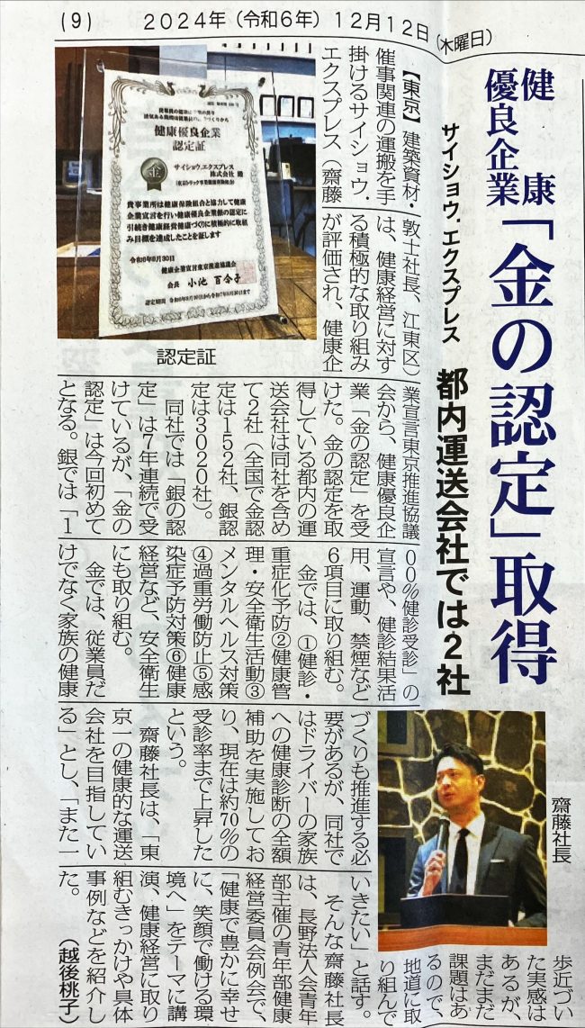 2024年12月12日(木)の物流ウィークリーにて 当社が健康優良企業「金の認定」を取得した記事が掲載されました。