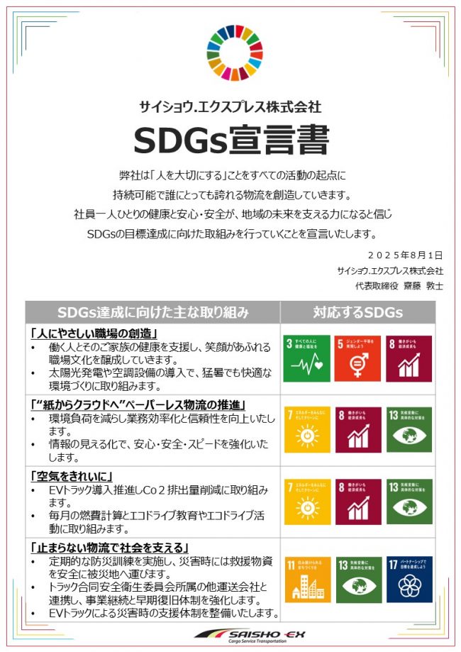 この度、当社は【人にやさしい職場の創造/ “紙からクラウドへ”ペーパーレス物流の推進 / 空気をきれいに/ 止まらない物流で社会を支える】の4項目を目標に掲げ「SDGs宣言」を策定いたしました。 宣言を契機…