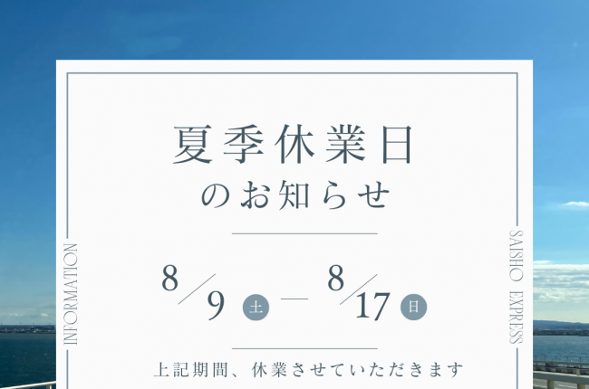平素は格別のご高配を賜り、誠にありがとうございます。 誠に勝手ながら、下記の期間を夏季休業とさせていただきます。 【夏季休業期間】 2025年8月9日(土)〜2025年8月17日(日) 休業期間中にいただきましたお問い合…