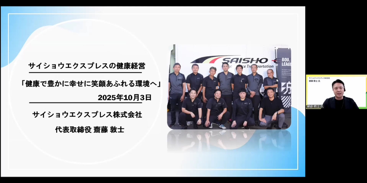 当社からは、トラックドライバーを中心とした社員の健康増進を目的に行っている運動施策の取り組み事例や、健康経営に力を入れるようになった経緯について発表いたしました。