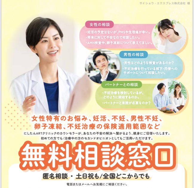 当社はこのたび「にしたんARTクリニック」のメディカル支援事業を行っているエクスコムグローバル株式会社と提携し、健康支援による無料AMH(卵巣予備能)検査の導入と妊活・不妊治療等の無料相談窓口を設置いたしました。 &nb…