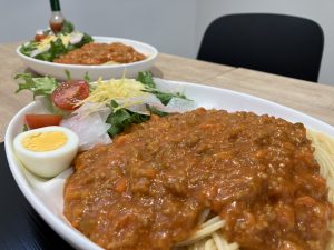 パスタは、玉ねぎ・人参・ピーマンにひき肉をたっぷり使用。