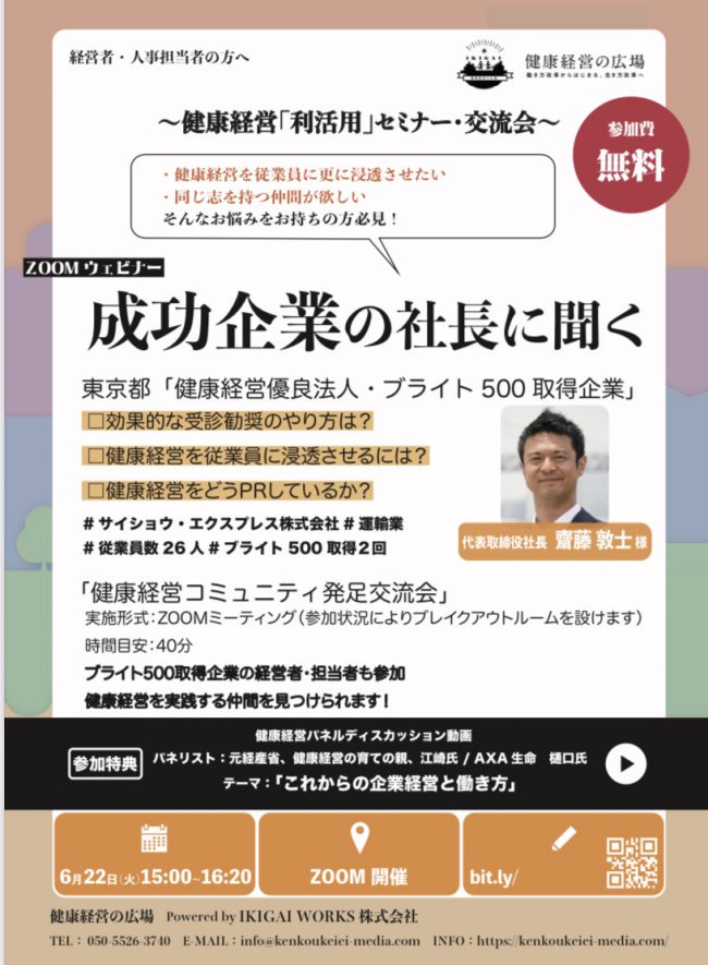 3月10日に開催される、中小企業健康経営推進協議会様、九州・福岡健康経営推進協議会様主催の「健康経営オンラインセミナー」にて、取組事例を発表させて頂きます。 弊社代表の斉藤が登壇いたします! 皆さんと健康経営についてたく…