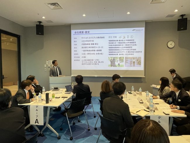 当社も参加しているトラック合同安全衛生委員会主催 「会社と社員の健康~幸せ~づくりセミナー」を開催し、当社の健康経営等の取り組みの事例発表を行いました。 当社の健康経営に取り組むまでの経緯、SAISHO健康…